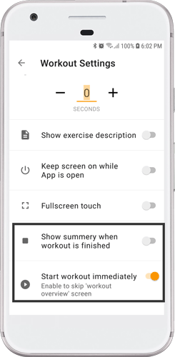 In some cases you may want to do multiple workouts in a single session. In this case you might find it annoying that you have to go through the process of pressing 'save log' after each workout. A better option would be to disable the 'workout summery screen' when the workout is finished. You can do this from Workout settings as illustrated in the screenshot below.